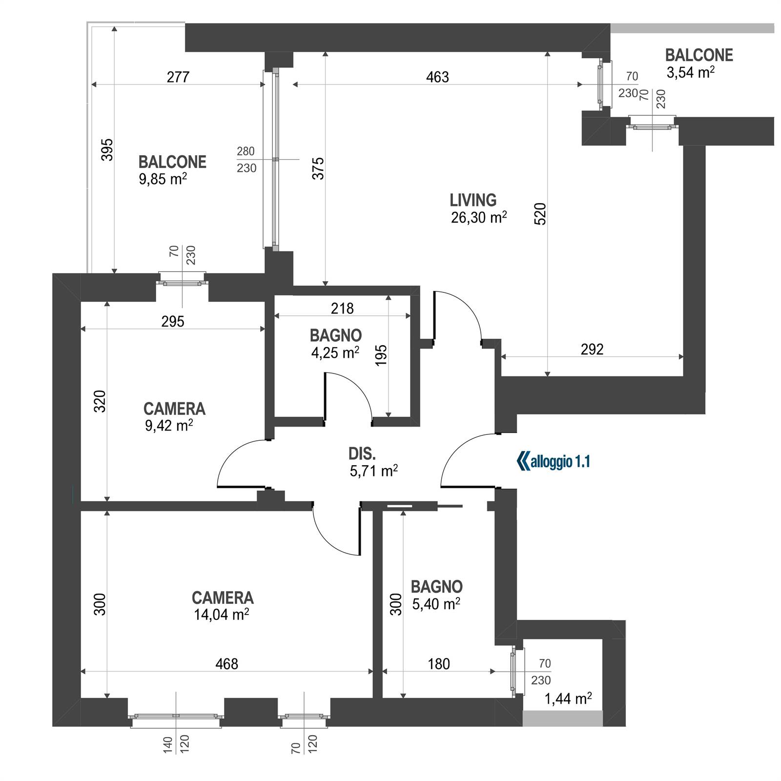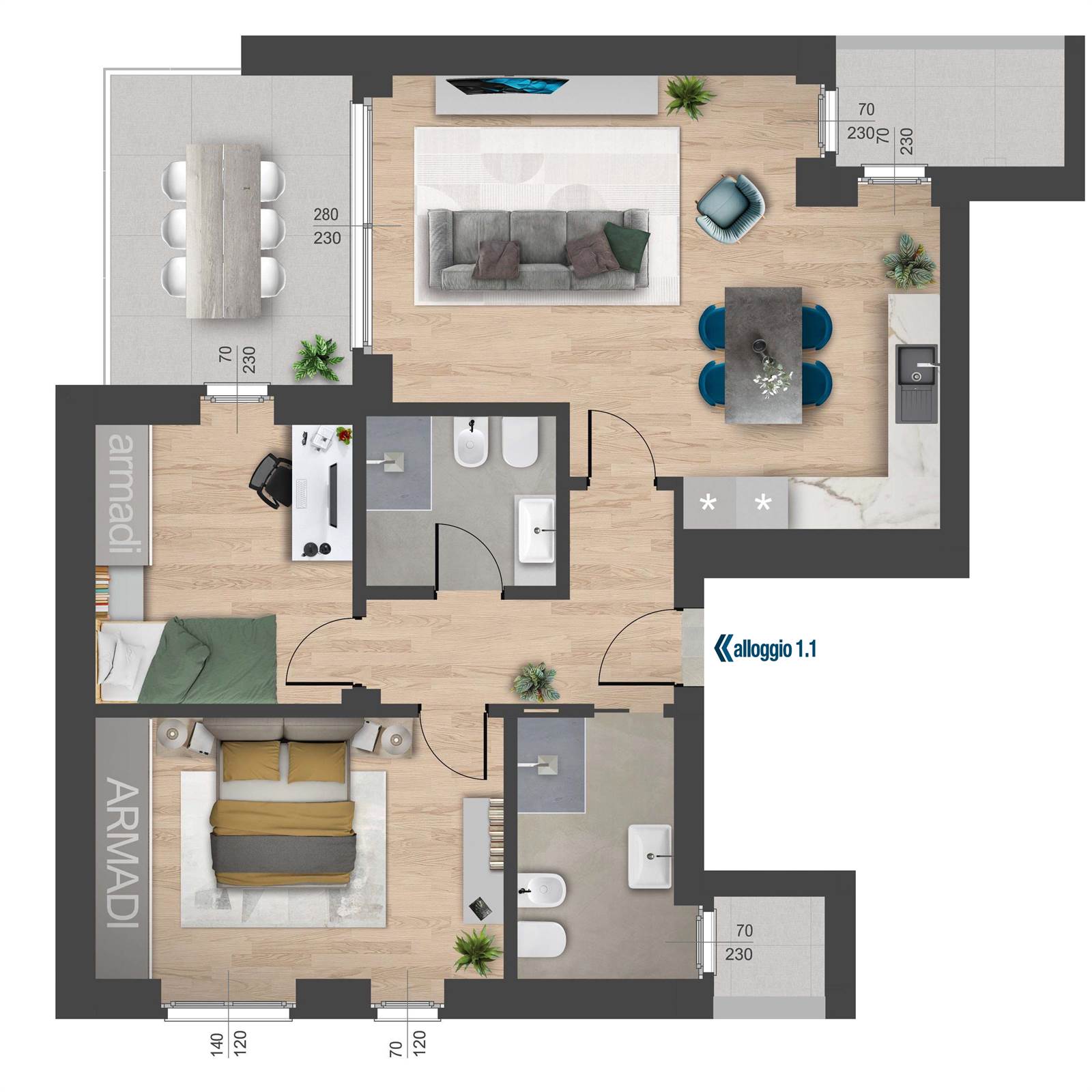 L'APPARTAMENTO E' AL PIANO PRIMO, ESPOSIZIONE SUD OVEST EST COMPOSTO DA INGRESSO, SOGGIORNO CON CUCINA LIVING, DUE CAMERE DA LETTO, DOPPI SERVIZI, TERRAZZO, BALCONI.