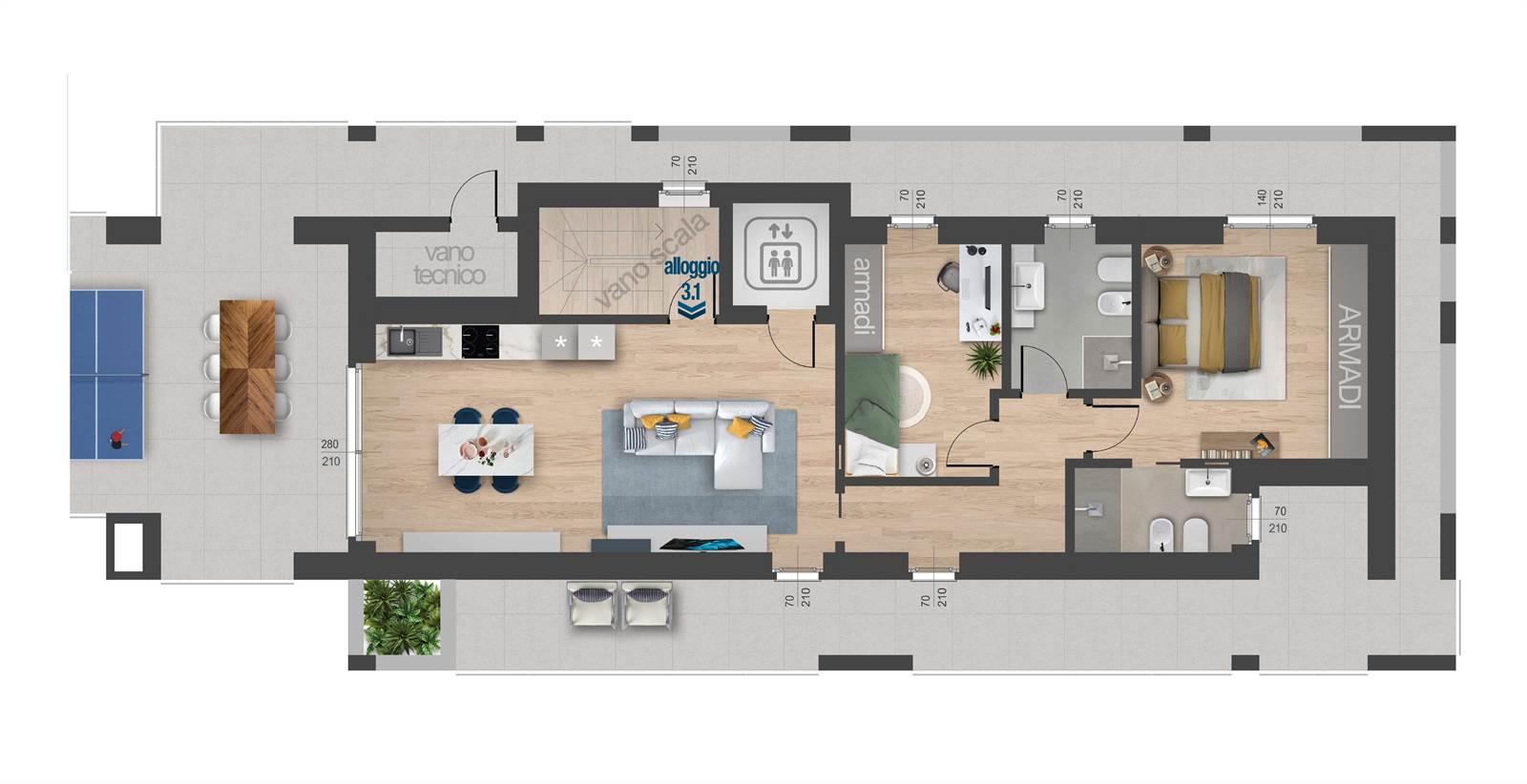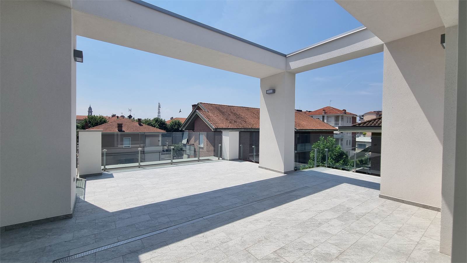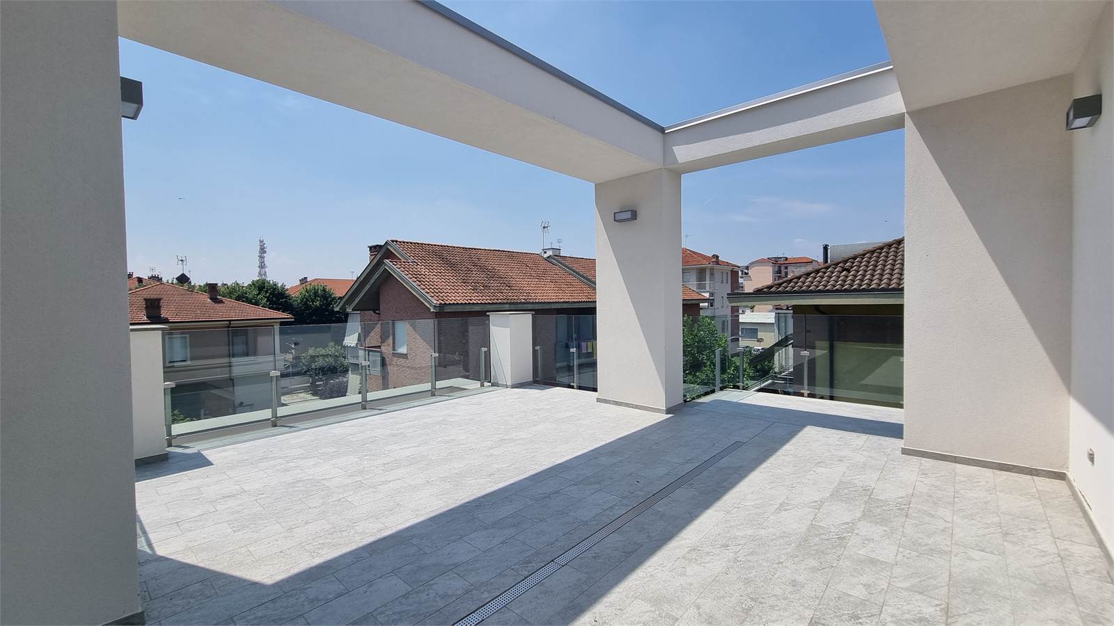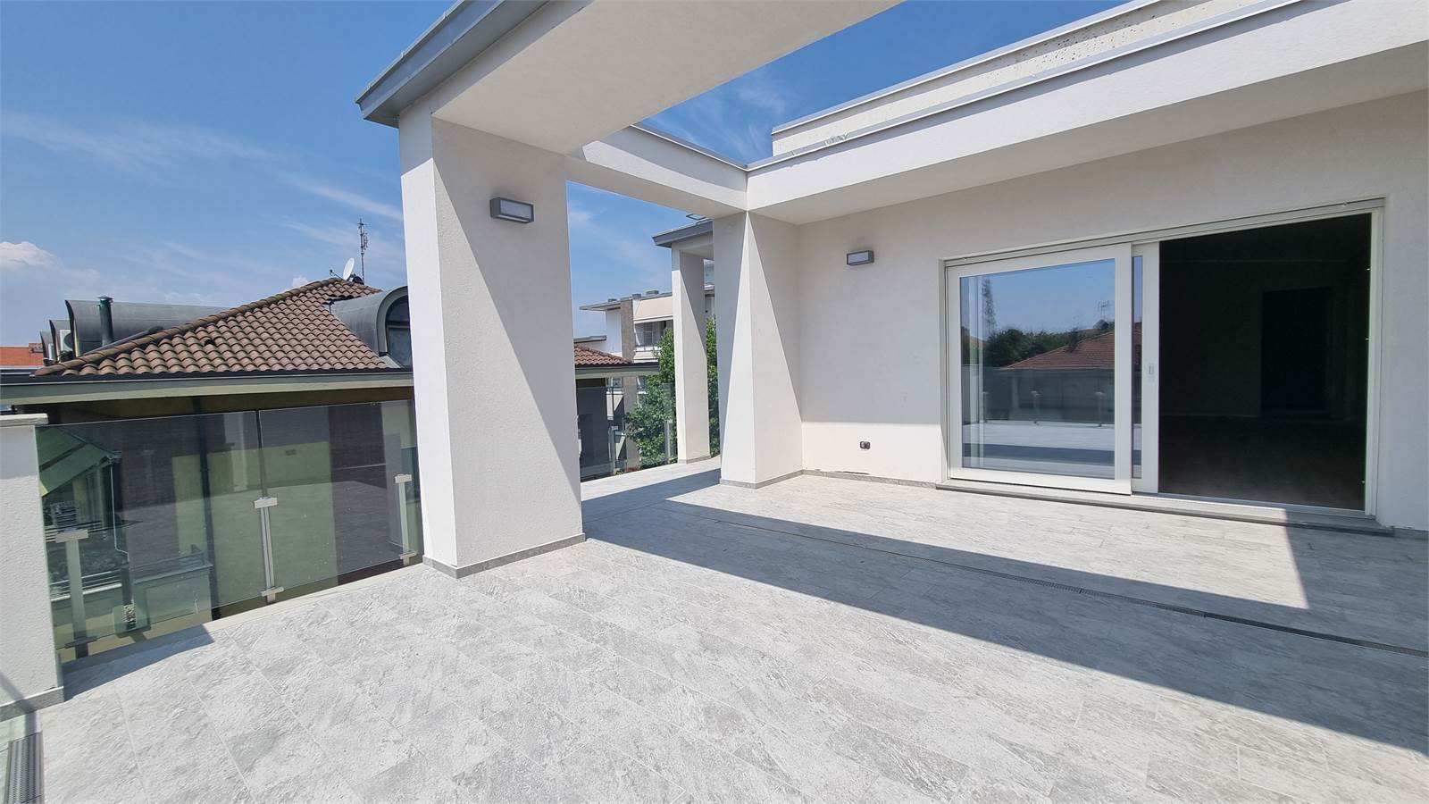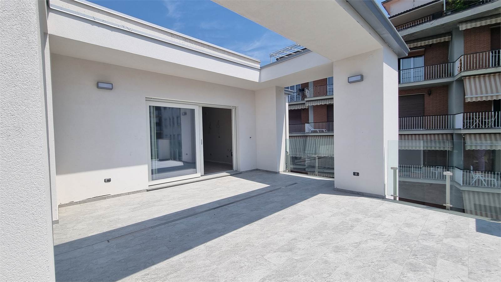 L'APPARTAMENTO HA ESPOSIZIONE SUD - EST - OVEST, ED E' COSI' COMPOSTO: ALLOGGIO AL PIANO TERZO ED ULTIMO CON INGRESSO SU SOGGIORNO CON CUCINA LIVING, DISIMPEGNO, DUE CAMERE DA LETTO, DI CUI UNO CON BAGNO DEDICATO, SECONDO BAGNO, GRANDE TERRAZZO A SUD E BALCONE SUGLI ALTRI 3 LATI.