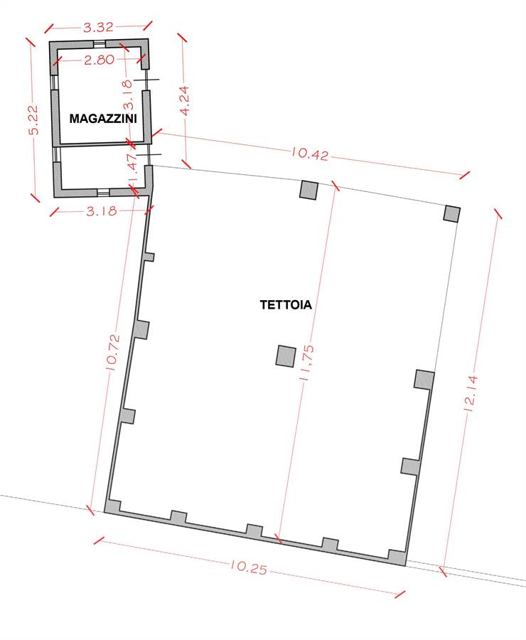 La proprietà è poi composta da un grande cortile ed una tettoia di oltre mq. 100 di fronte, lato strada e dei magazzini.